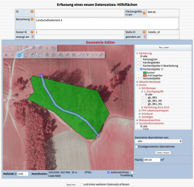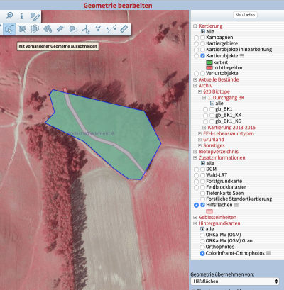 Um die Hilfsflächen zum Ausschneiden verwenden zu können, muss beim Editieren eines vorhandenen Kartierobjektes das Werkzeug „mit vorhandener Geometrie ausschneiden“ ausgewählt sein und rechts in der Auswahl „Geometrie übernehmen von“ der Layer „Hilfsflächen“ gewählt sein. Wenn man dann die Hilfsfläche in der Karte anklickt, wird dessen Fläche aus der Kartiergeometrie ausgeschnitten.