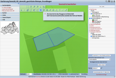 Mit der Funktion „Polygone teilen“ wird nur die Geometrie zerteilt und daraus entsteht ein MultiPolygon mit mehreren Formen. Es entstehen dadurch also noch keine zwei Kartierobjekte. Es wird aber eine Fehlermeldung angezeigt, dass eine Selbstüberschneidung vorliegt.