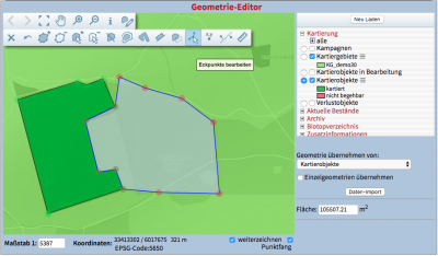 Wenn man ein Polygon zeichnen möchte, welches direkt an an benachbartes angrenzt, bietet sich die Funktion „mit vorhandener Geometrie ausschneiden“ an. Soll ein Polygon jedoch an einer Ecke mit einem anderen in einem Punkt zusammenfallen ist der Punktfang einzusetzen. Der Punktfang läßt sich über die Checkbox links unter der Karte einschalten. Alle Stützpunkte der in der Karte sichtbaren Polygone bekommen somit eine hellgrünen transparent dargestellten Kreis. Diese Kreise kann man beim Zeichnen eines neuen Polygones anklicken somit werden die Punkte gefangen. Soll das Polygon nachträglich bearbeitet werden nutzt man die Funktion „Eckpunkte bearbeiten“. Hierbei können die in Rot dargestellten Eckpunkte des neuen Polygons auf die grünen Fangpunkte verschoben werden.